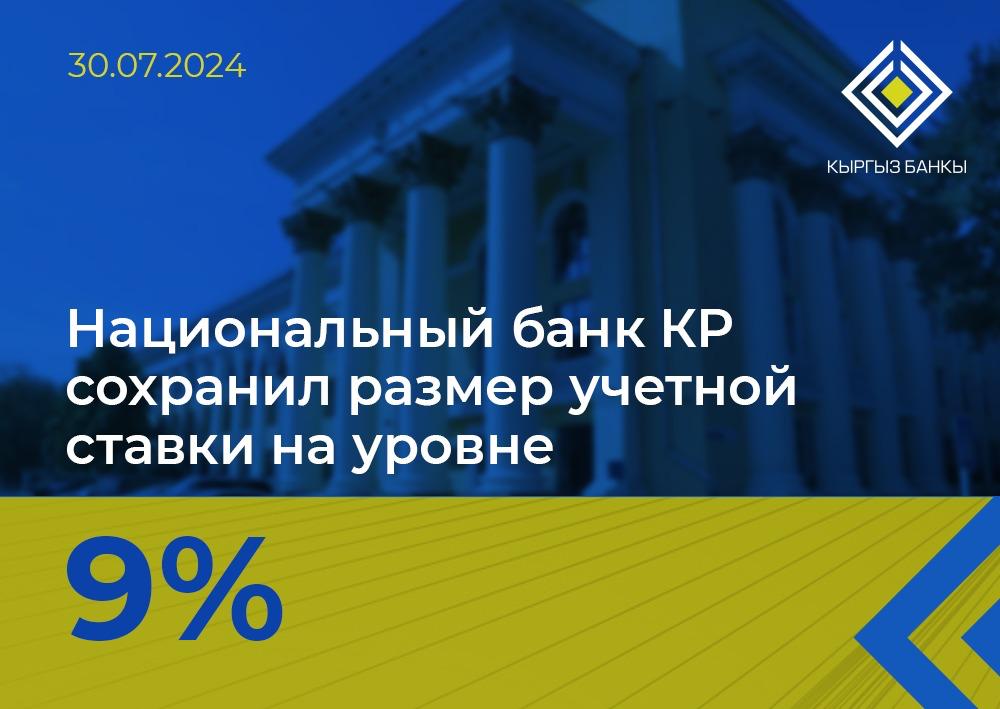 Правление Национального банка Кыргызской Республики 29 июля 2024 года приняло решение сохранить учетную ставку (ключевую ставку) на уровне 9,00 процента. Решение вступает в силу с 30 июля 2024 года.